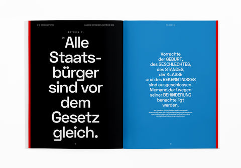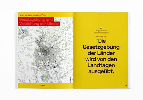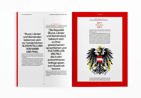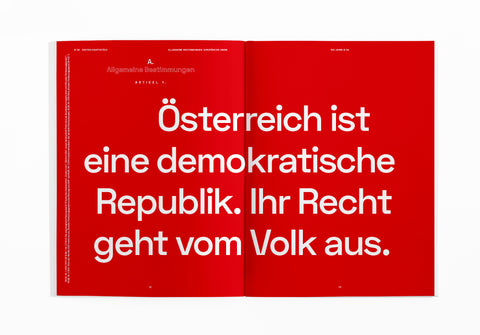 Das Magazin beinhaltet nicht nur das „Bundes-Verfassungsgesetz (B-VG)“, sondern darüber hinaus auch weitere im Verfassungsrang stehende Texte: den Staatsvertrag von 1955, das Staatsgrundgesetz über die allgemeinen Rechte der Staatsbürger von 1867 und die Europäische Menschenrechtskonvention. Durch diese besondere typografische Umsetzung erschließt sich der Text für den Leser in einer ganz neuen Form.