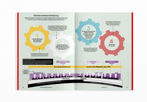 Ein umfangreicher Infografik-Teil darüber, wie die Republik funktioniert und welche grundsätzliche Rolle dabei die Verfassung spielt, rundet das Magazin ab. Darin zu finden: der Ablauf einer Wahl, die Entstehung von Gesetzen, die Gewaltenteilung sowie eine Sammlung von unterhaltsamen Zitaten aus der Verfassung, denn auch die gibt es.